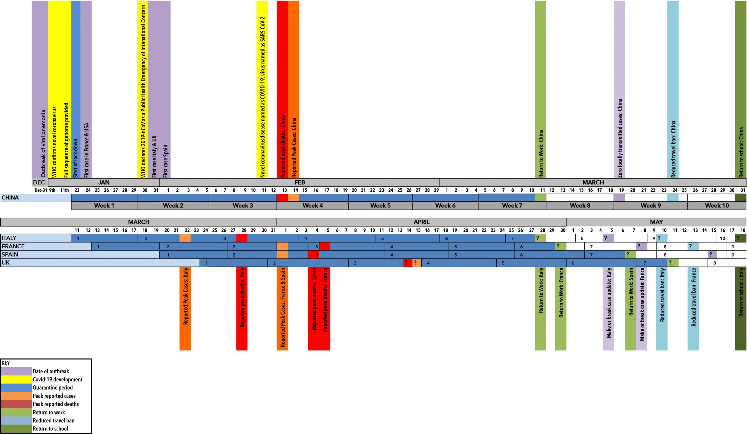 Italy & France, week commencing April 27th, Spain May 4th and the UK preliminary data suggests May 13th.